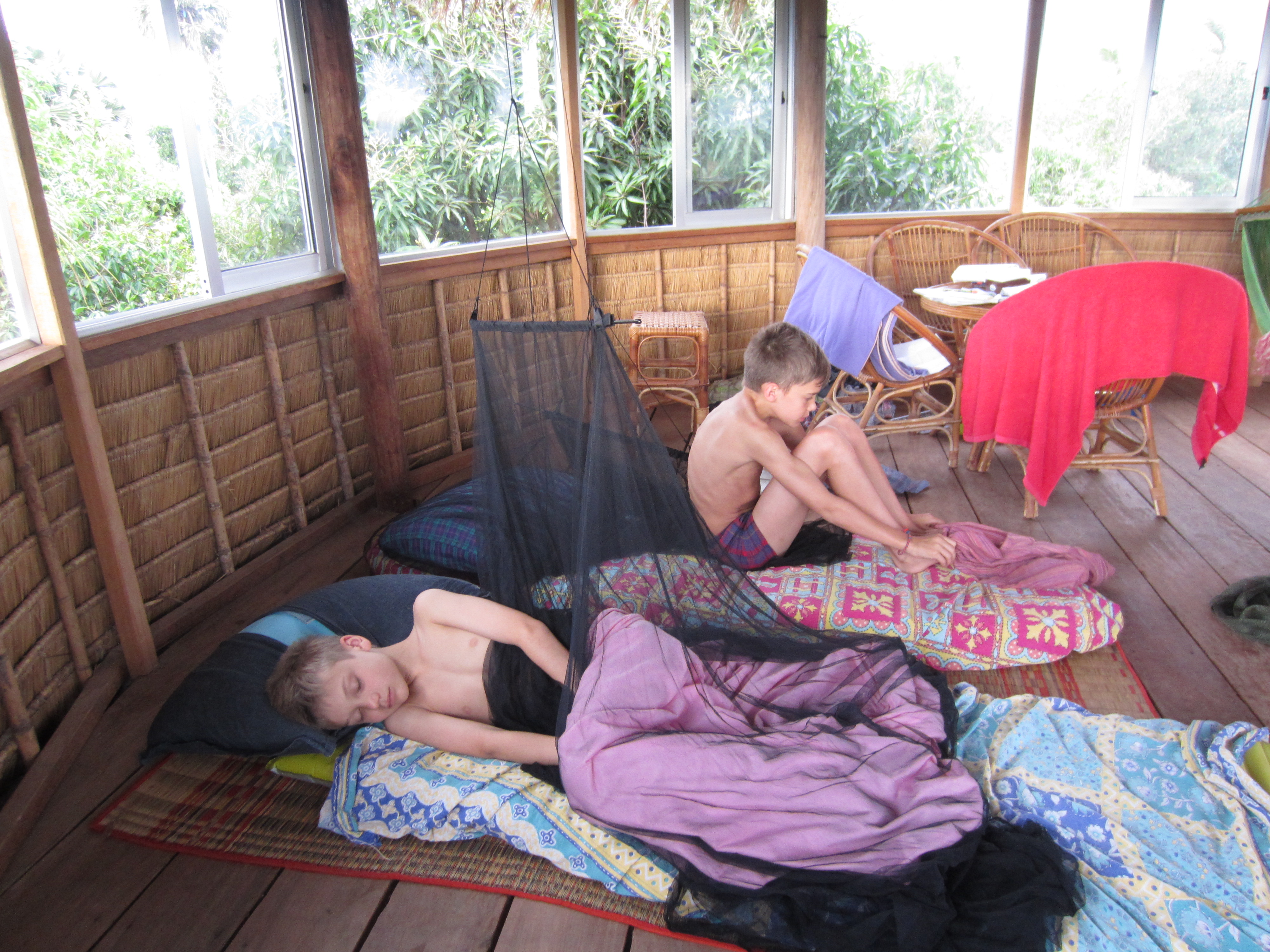 Next stop, Kampot on the southern coast of Cambodia, a quiet, riverside town best known for its eponymous Kampot pepper. We had a very peaceful and relaxing few days at the Ganesha eco-resort, a much needed change of pace after so much urban sightseeing. We rode bikes, canoed through the mangroves, napped, played cards, enjoyed the warmth and quirkiness of our lovely French hosts, and stressed over which of the many hammocks, hanging beds and relaxing spots to choose from… so many, so little time. We had our hands-down best lodging of the whole trip… a three story circular stone tower with hammocks and panoramic views of the surrounding rice paddies and distant Bokor mountains on the third floor (this became boy headquarters and yoga central). As long as you don’t mind sharing your bathroom with frogs and your bedroom with large geckos, waking to 5 a.m. Call to Prayer at the neighboring mosques, and spirited Cambodian weddings with loud PA systems that pulse with music all night on weekends, you will love Ganesha. And we did!!!!