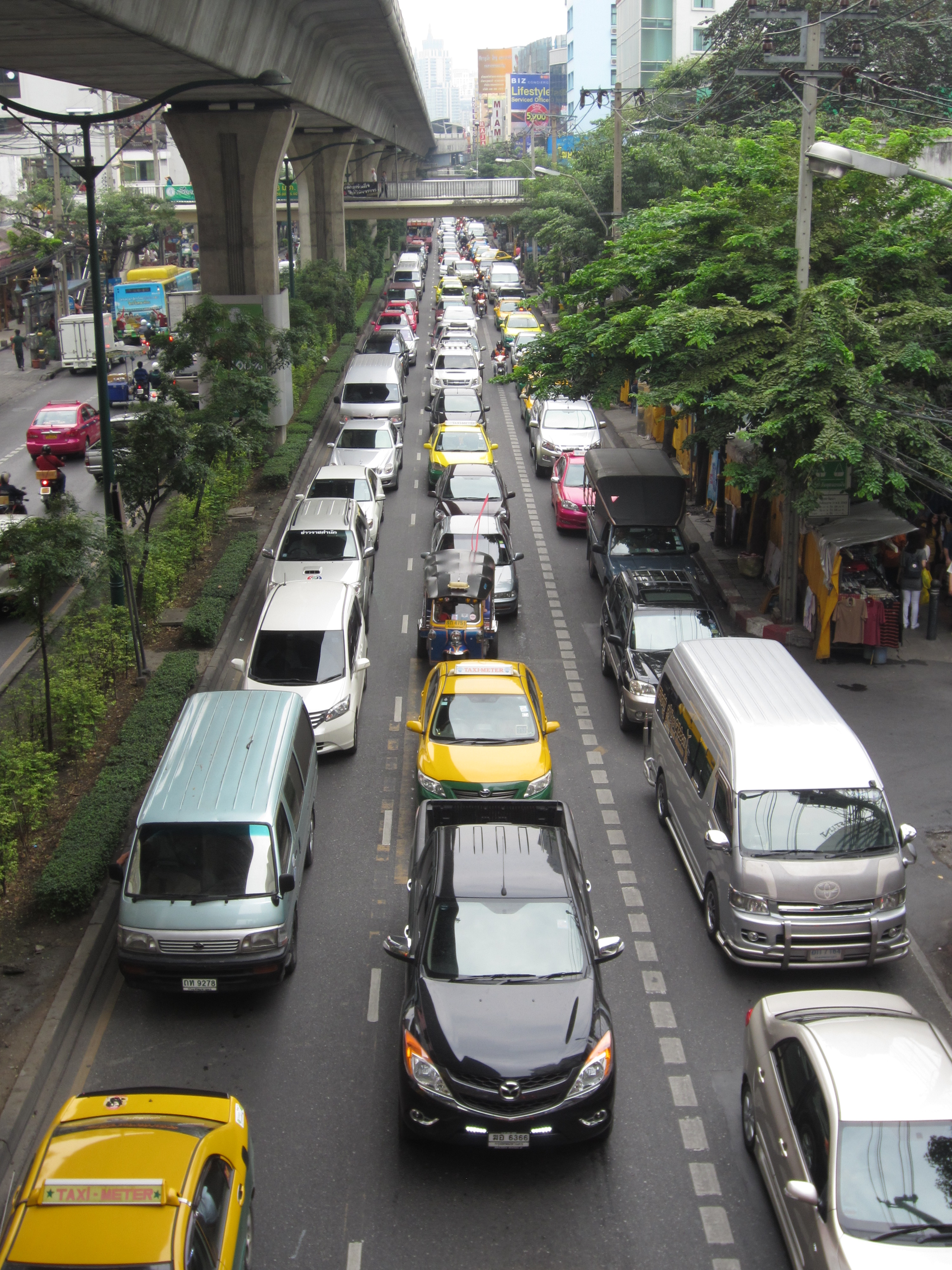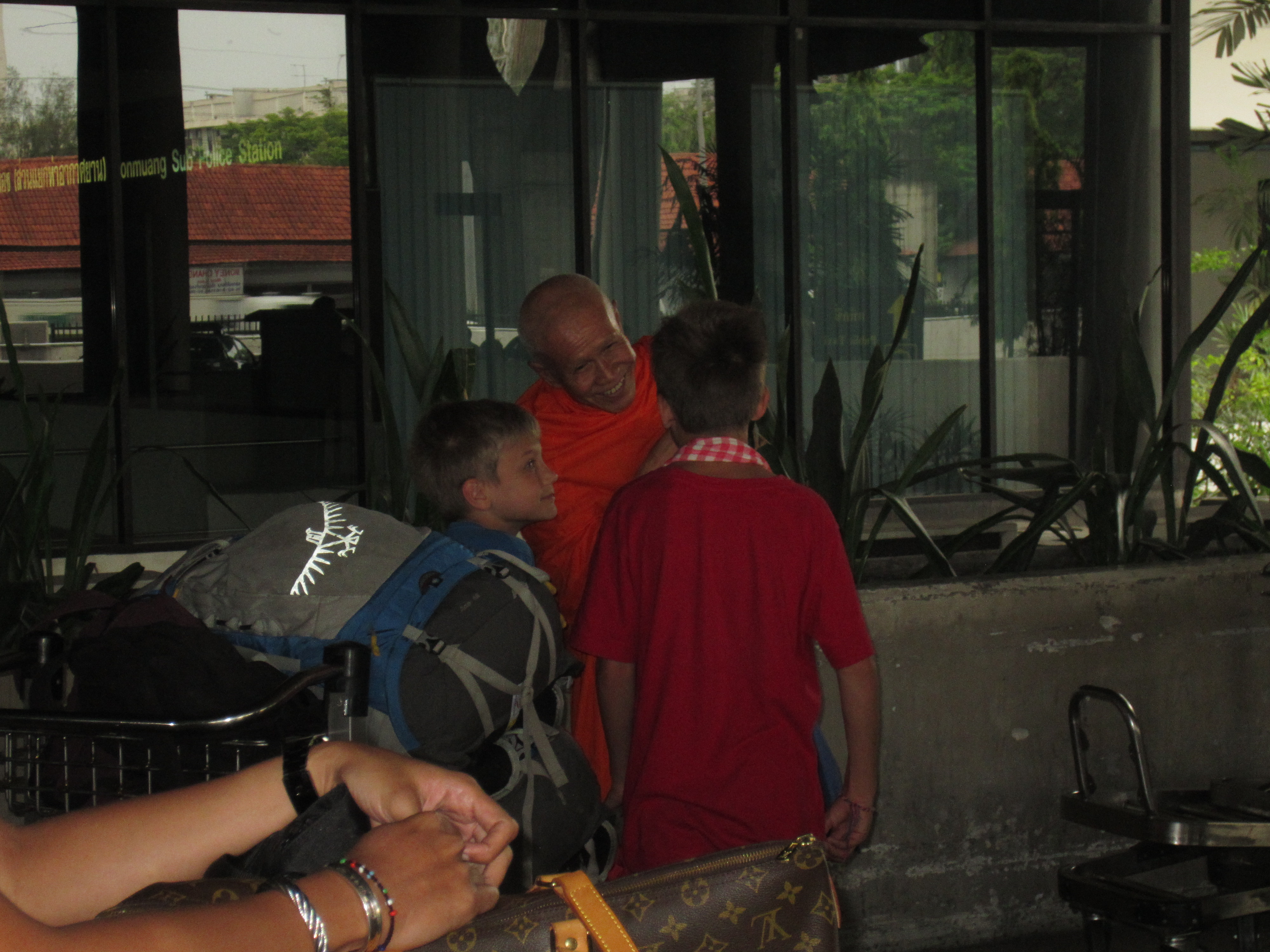 Speaking with a monk at Don Mueang airport, Bangkok, ThailandEnjoying the rooftop pool, Four Points Hotel, Sukhumvit 15, Bangkok, ThailandEnjoying 2 for 1 happy hour on the rooftopGridlock on Sukhumvit with new SkyTrain above“Dessert”Amy and the boys, random alley, Bangkok, ThailandBraxton getting a (ticklish?) foot treatment at Dr. Fish, Khao San Rd., Bangkok, ThailandHead of 46 meter long reclining Buddha at Wat Pho, Bangkok, Thailand