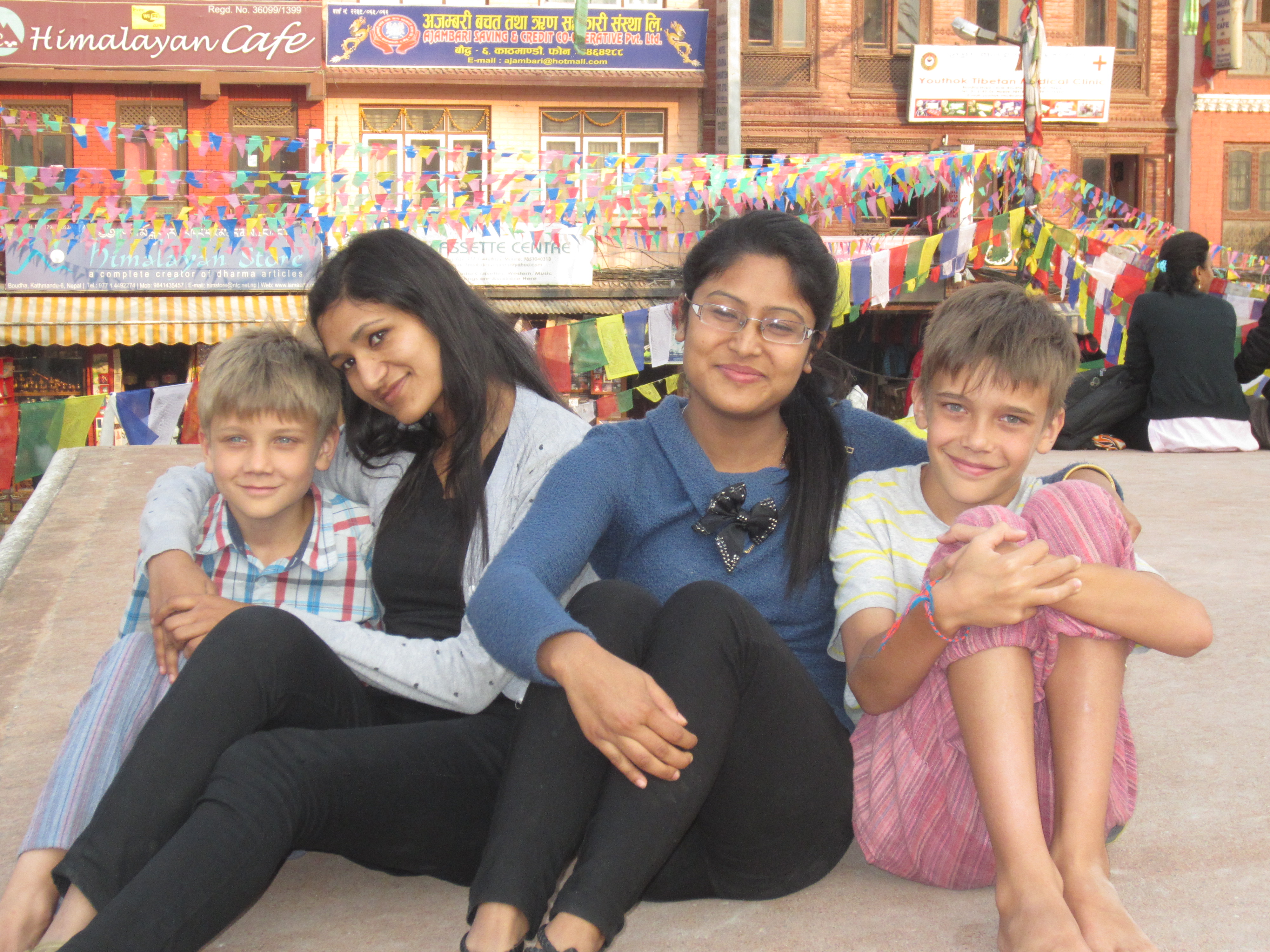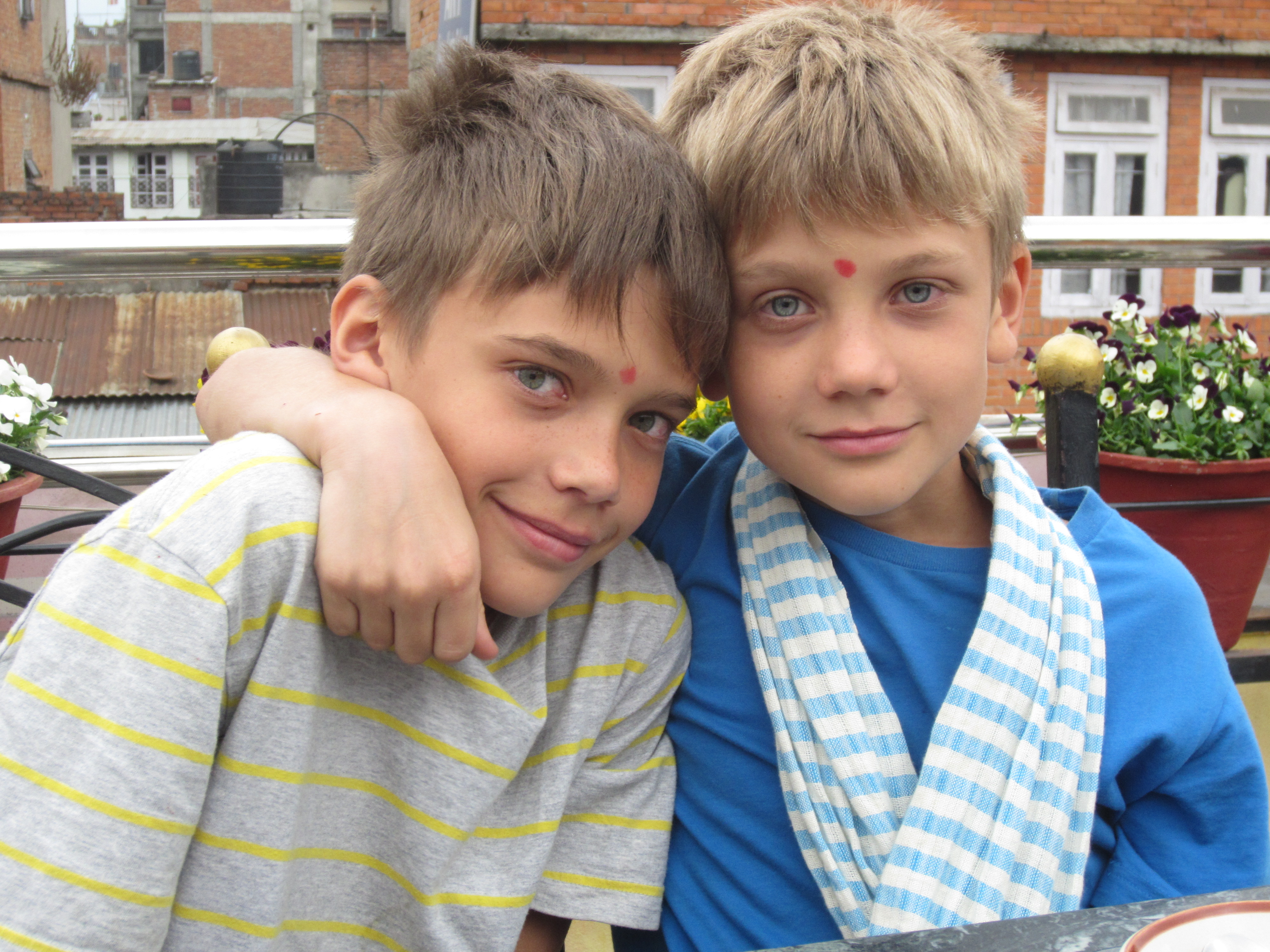 It did not hurt the first impression of Kathmandu that we decided to stay in Bodhnath (or Boudha) on the good recommendation of our friends Kevin and Sarah. Boudha is the home of Asia’s largest Buddhist stupa and is inhabited primarily by Tibetan refugees. Our first afternoon in the country was spent circumambulating the Bodhnath Stupa with the maroon-robed monks and other devotees under fluttering prayer flags with the scent of yak butter candles in the air. Among the many people who took an interest in boys (but who could not care less about the boys’ parents) were two newly minted nursed who wanted to practice their English. The boys have enjoyed celebrity status throughout the trip, but Nepal has brought it to a new level.
