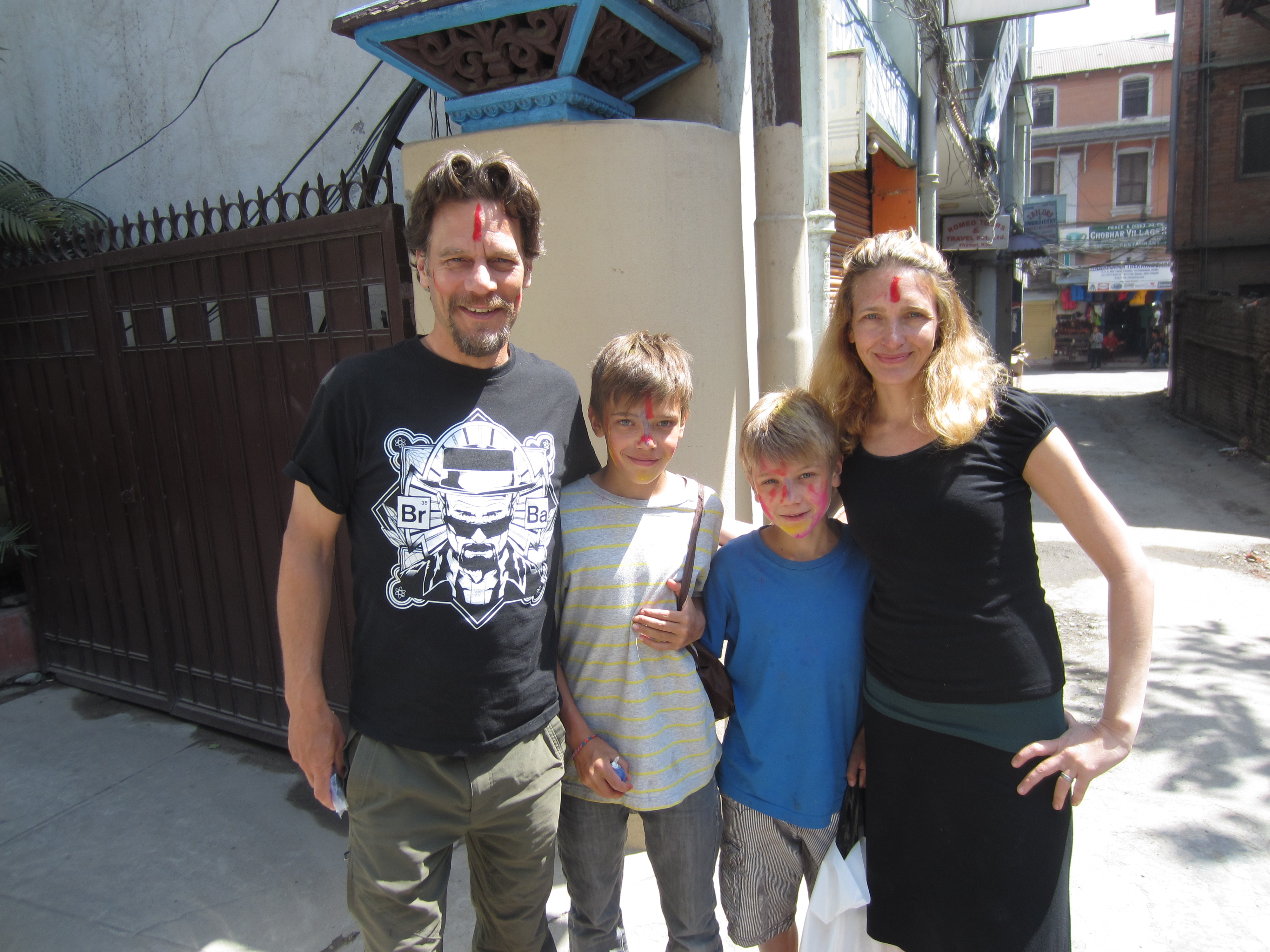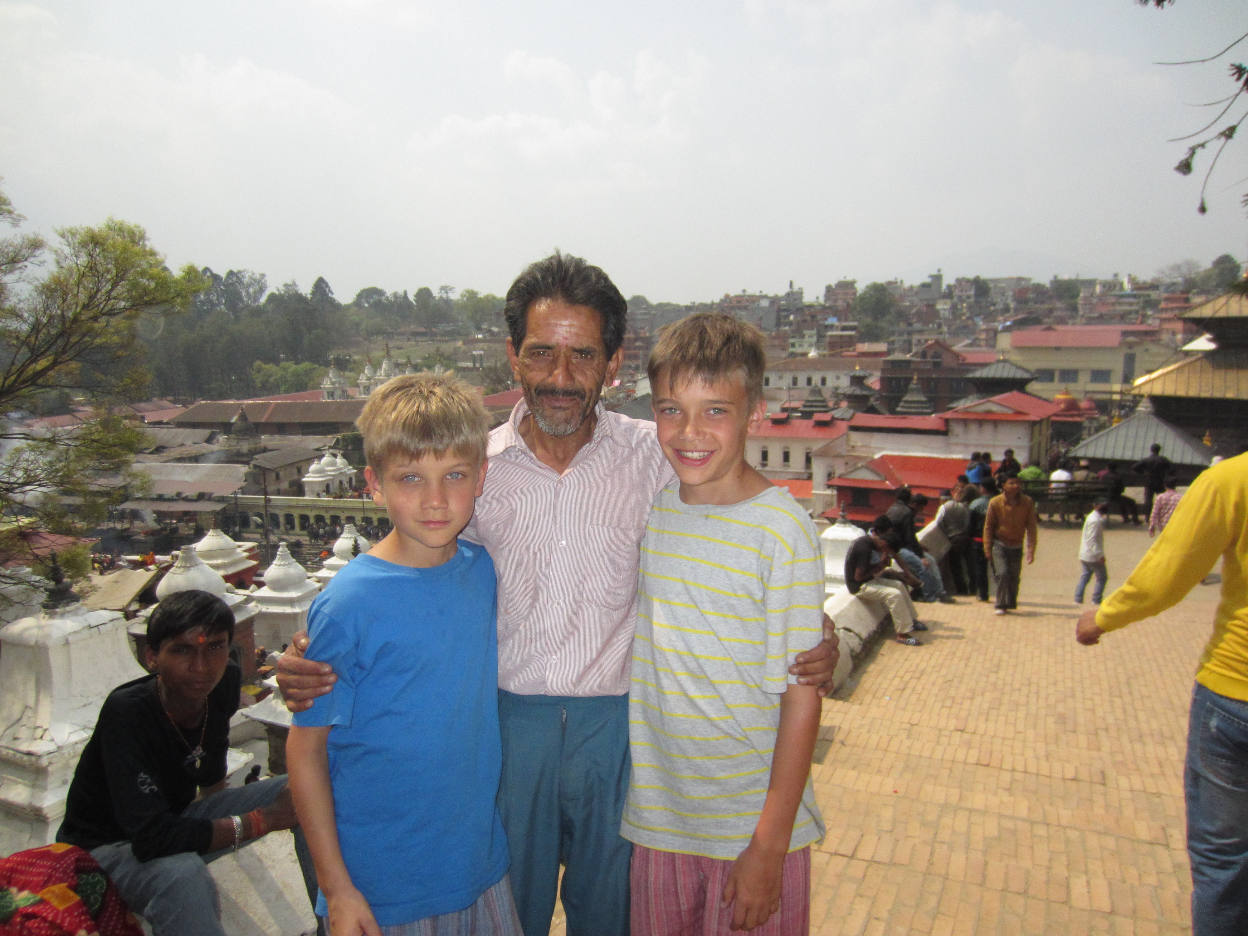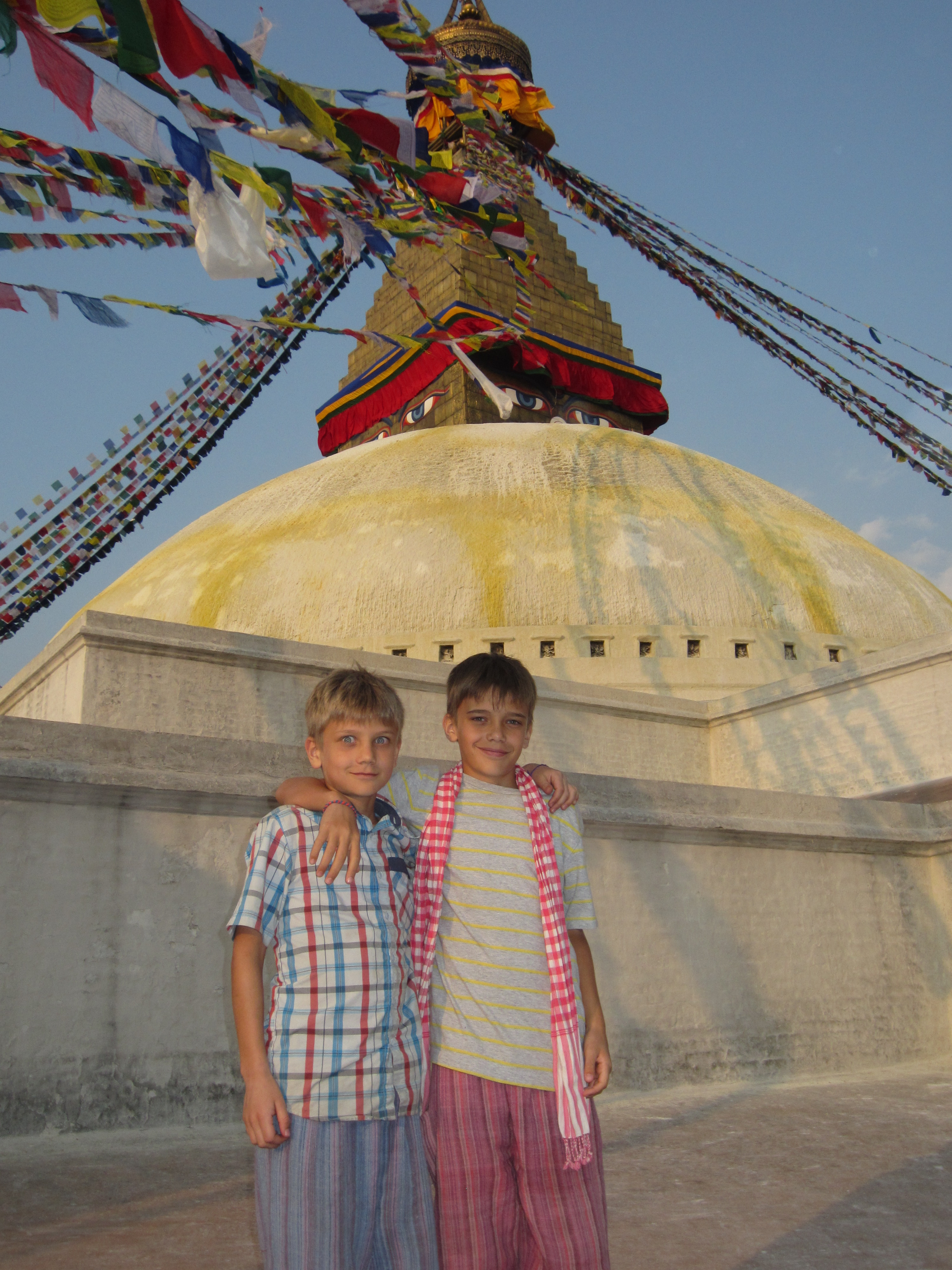 Standing on the plinth of the Bodhnath Stupa, Boudha, NepalThe boys and their new friendsThird eyes open during Maha Shivaratri, Durbar Square, Kathmandu, NepalStrolling home past hand-cranked ferris wheel, Boudha, Nepal