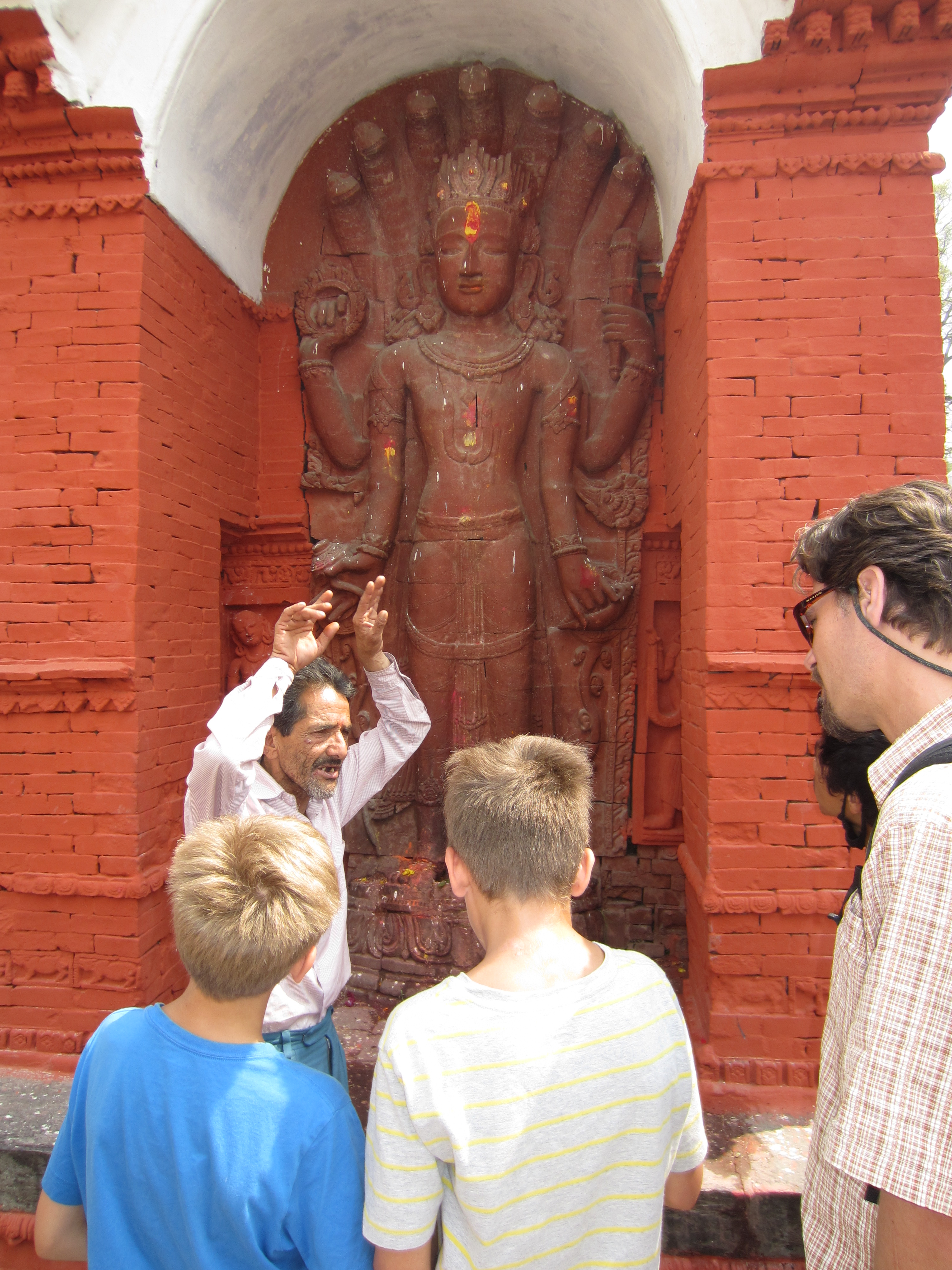 The cremation ghats of Pashupatinath on the Bagmati River, Kathmandu, NepalDevotees begin to gather on the Bagmati ghats in anticipation of Maha Shivaratri, PashupatinathA series of 11 small temples each housing a Shiva Lingam, PashupatinathMr. Badal explaining the significance of the Naga in Hindu mythology, PashupatinathMr. Badal and the boys at Pashupatinath