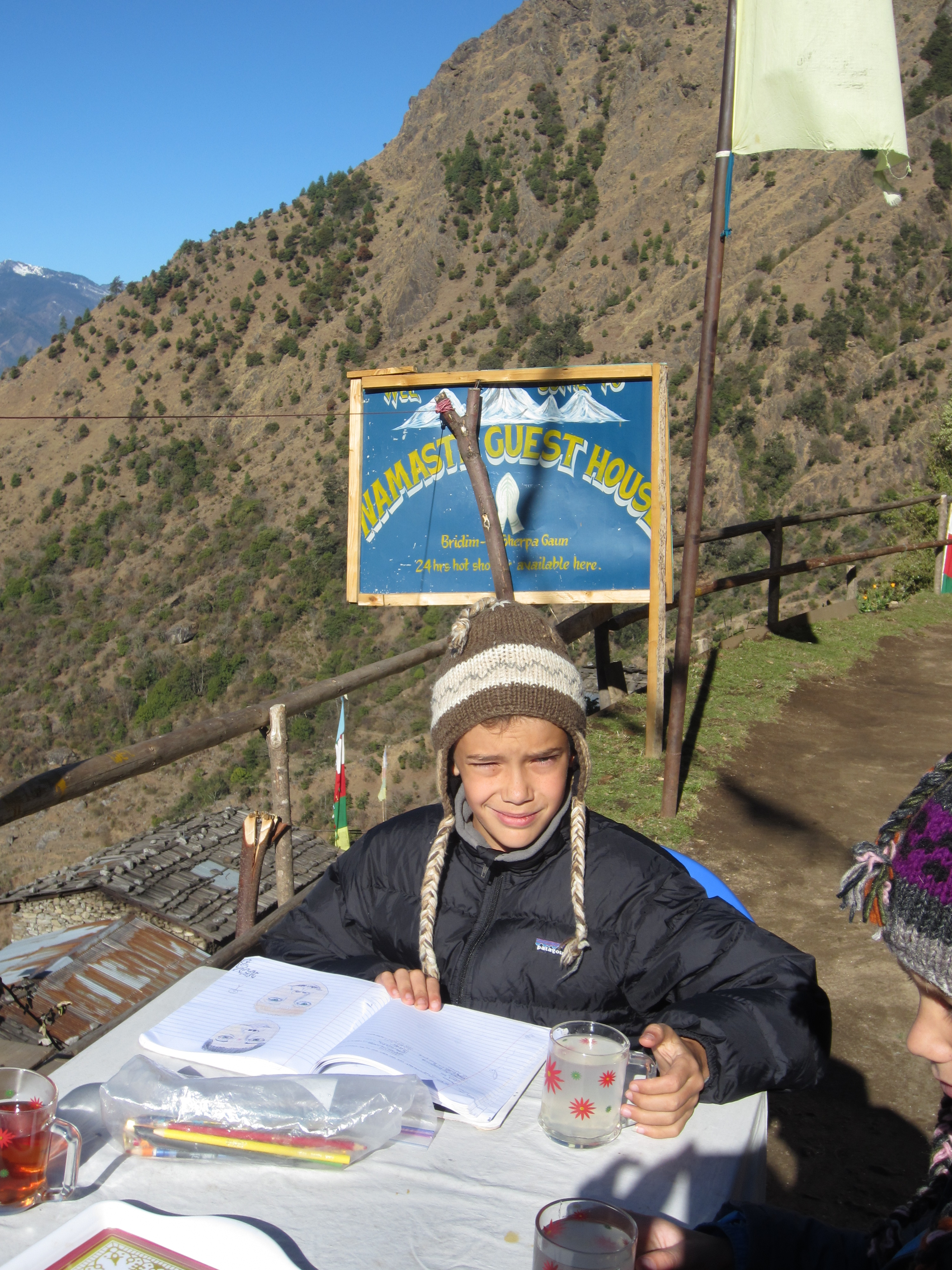 In addition to the lowly pack-animal porter hauling commodities up the trail, many trekkers hire their own personal porters to carry their gear so they can walk with a small day pack. The juxtaposition of doughy trekker with day pack against sinewy porter with three large backpacks strapped around his head and back was a tough one to see over and over again. We are used to carrying our own gear when we hike, and did so on this trek. But was that the “right” thing to do? As a result, we left at least one Nepali unemployed who would otherwise have made as much as $15-20 per day carrying our stuff. The porters we passed were not concerned about this dilemma and instead invariably commented with glee on the size of the boys’ packs. Some images from the trail.