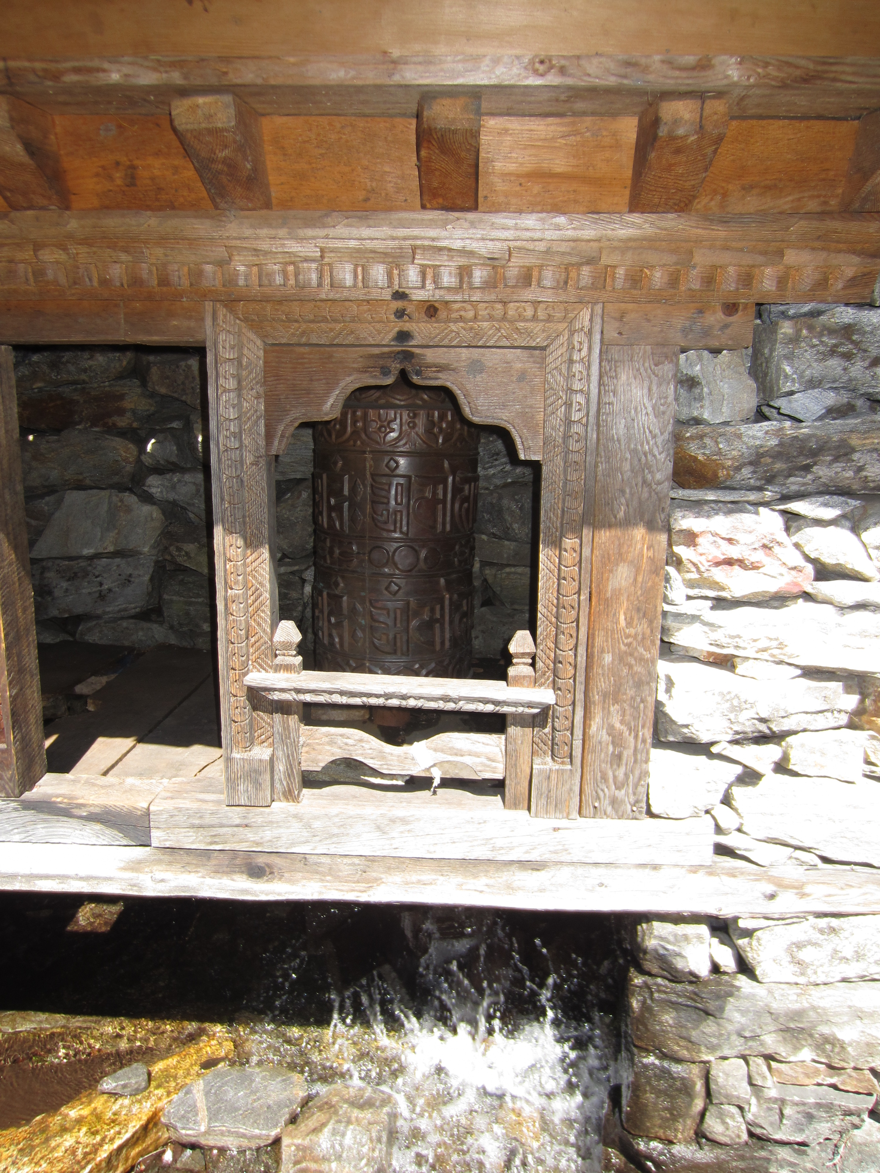 Water-powered prayer wheel along the trail, LangtangCarved and painted inscriptions along the trail, Langtang ValleyHiking past a mani wall and yak/cow hybrids, Langtang ValleyPassing a forest chorten on a slushy day, below Foprang Danda
