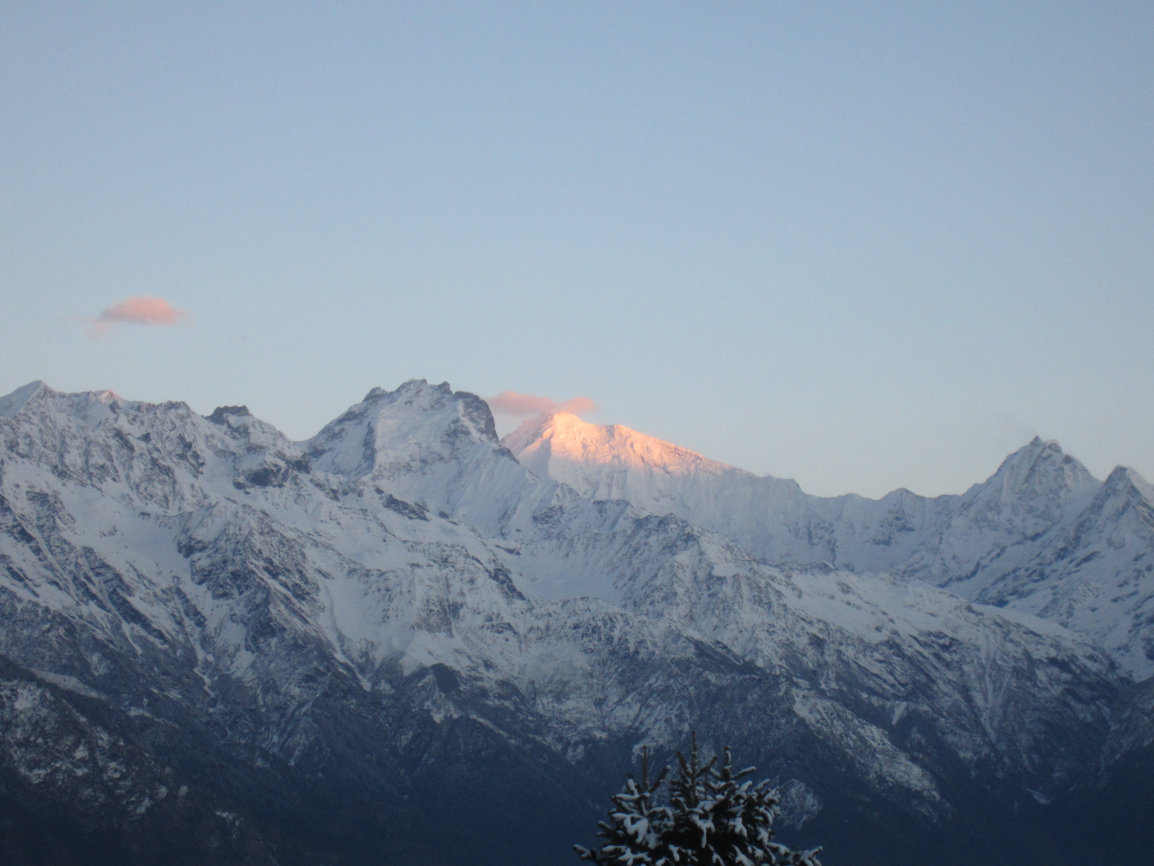 Hunkering down during rainstorm on the way to Foprang DandaOne of two buildings in Foprang DandaThe other building in Foprang DandaFirst light on the Ganesh Himal (7000+m), from bed in Foprang Danda