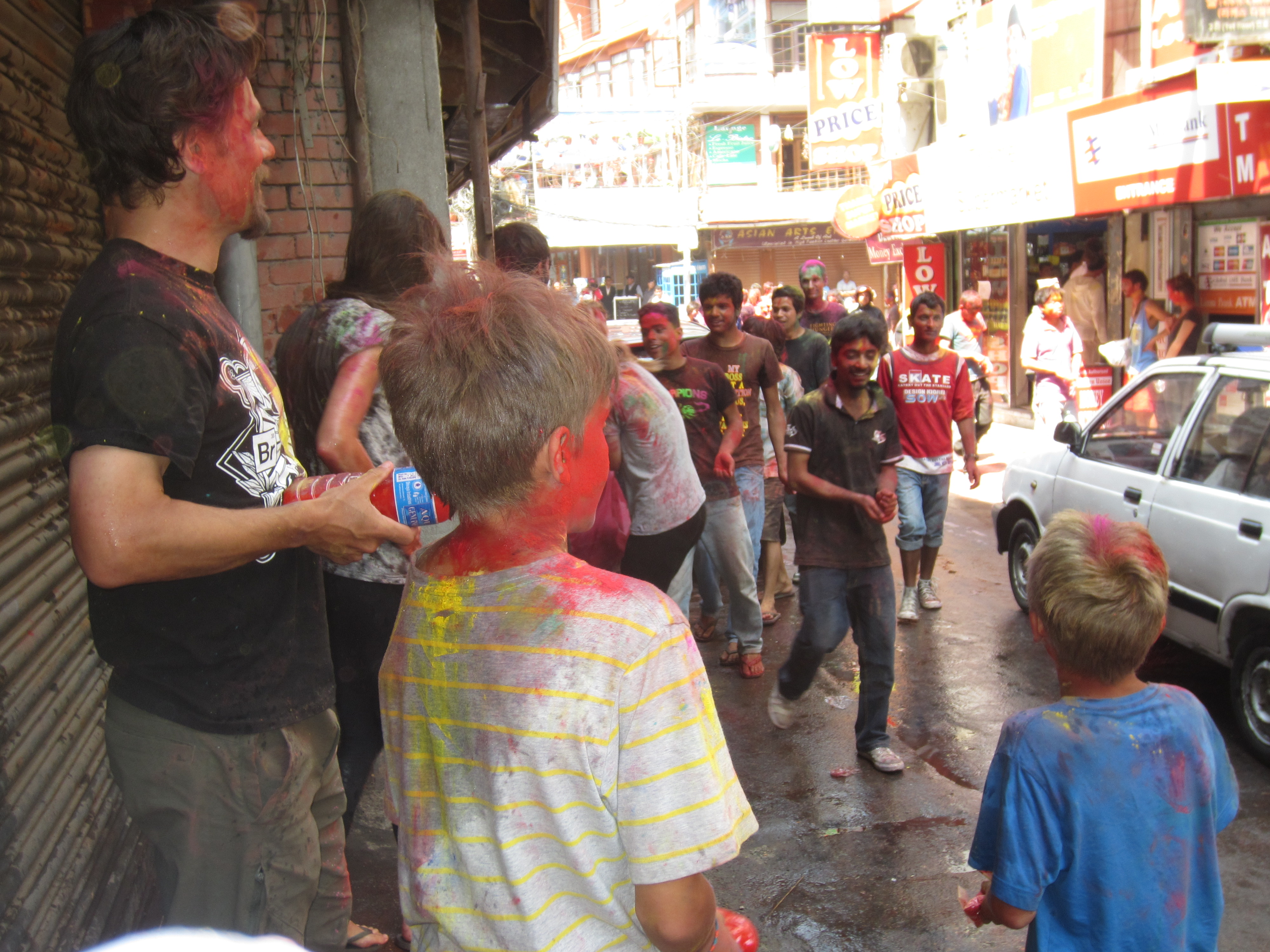 Securing Holi supplies the night before, KathmanduMarked as Holi participants, KathmanduAfter an hour on the streets, Holi, KathmanduWatching the Holi mayhem from the sidelines, KathmanduThe boys in a gang of Holi kids, KathmanduHeisenberg does Holi