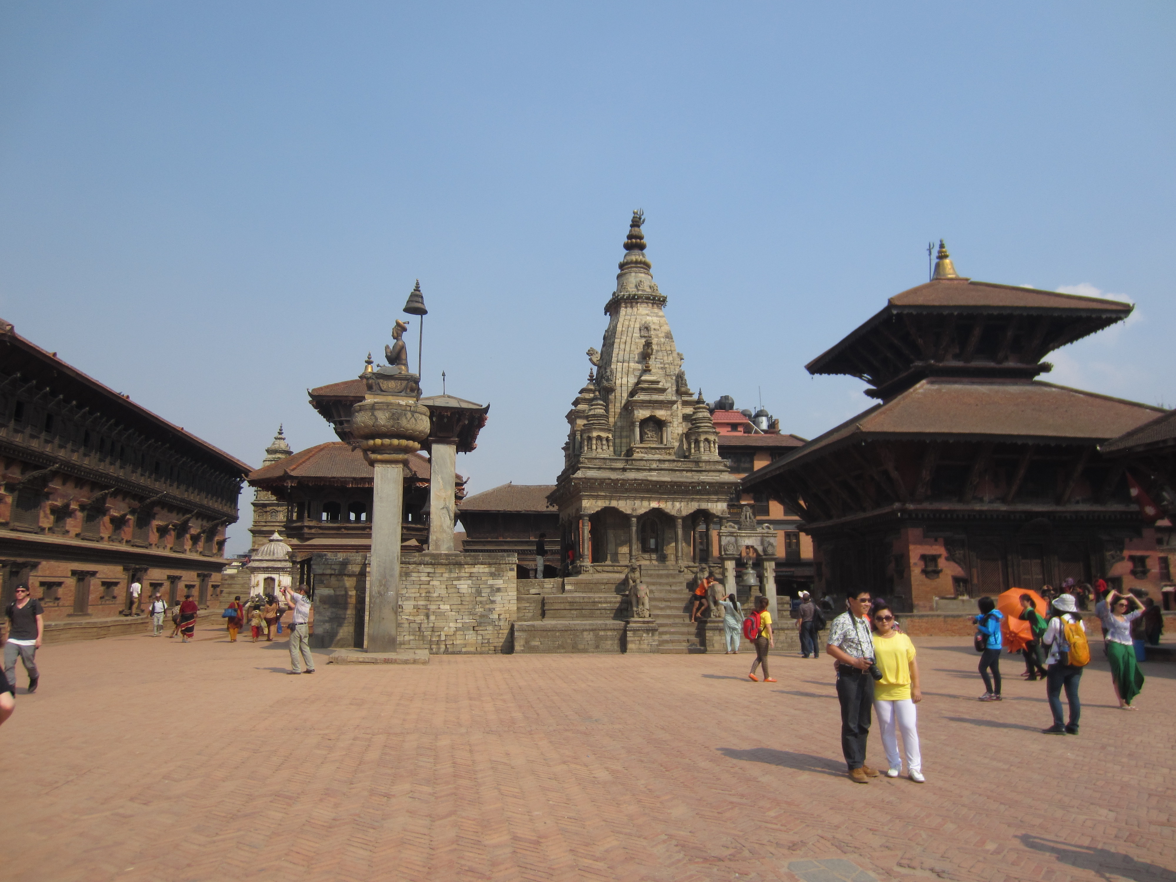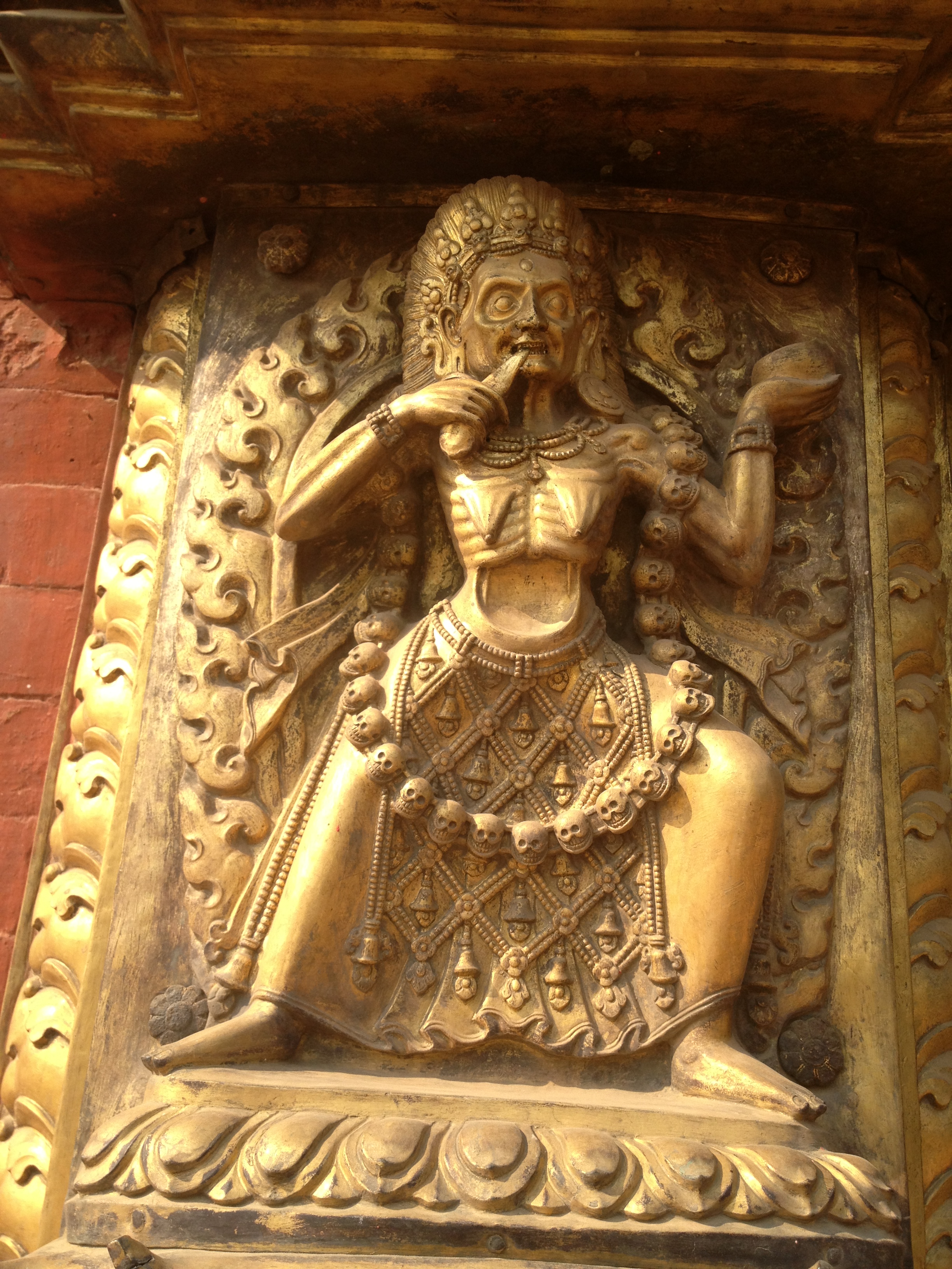 The constant presence of religious objects repeats itself throughout the Kathmandu Valley, an area stretching approximately 15 km north to south and 30 km east to west and consisting of many smaller towns and neighborhoods. Boudha and Dhulikhel are two we’ve written about. We also visited Panauti at the confluence of the sacred Roshi and Pungamati Rivers (yes, more sacred rivers) and Swayambhunath, the “Monkey Temple”, mentioned above. Finally, we spent one night in the former city state kingdom of Bhaktapur with its famous Durbar (or Palace) Square and its many other plazas surrounded by temples to the various gods. Our travels within the Kathmandu Valley only scratched the surface in this densely populated and historically rich part of Nepal. In all of these places it is difficult to walk ten feet without passing a Ganesh figure smeared with red paste, or a Buddhist stupa surrounded by prayer flags. And with the panoply of gods and other characters (demons, various incarnations of each god, their children and consorts, and their animal companions or vehicles [vahana]), it is often difficult to understand who is being worshiped and for what purpose. Some gods are well-known and the obvious object of worship if you know what to look for (a trident is Shiva’s weapon of choice, a Garuda is Vishnu’s vahana), but others are a bit more obscure. For example, the toothache god hiding in an old snag of wood covered with coins that had been nailed to the misshapen tree trunk. The fact that his little shrine was located in a district with lots of dentist offices didn’t make his purpose that much more obvious to the uninitiated. For what is, in some sense, a one-man show, the Buddhist system also includes a surprisingly large number of characters, many of them borrowed from the older Hindu system. (This intermingling includes the belief among some Hindus that Buddha is the ninth incarnation or avatar of Vishnu.)
