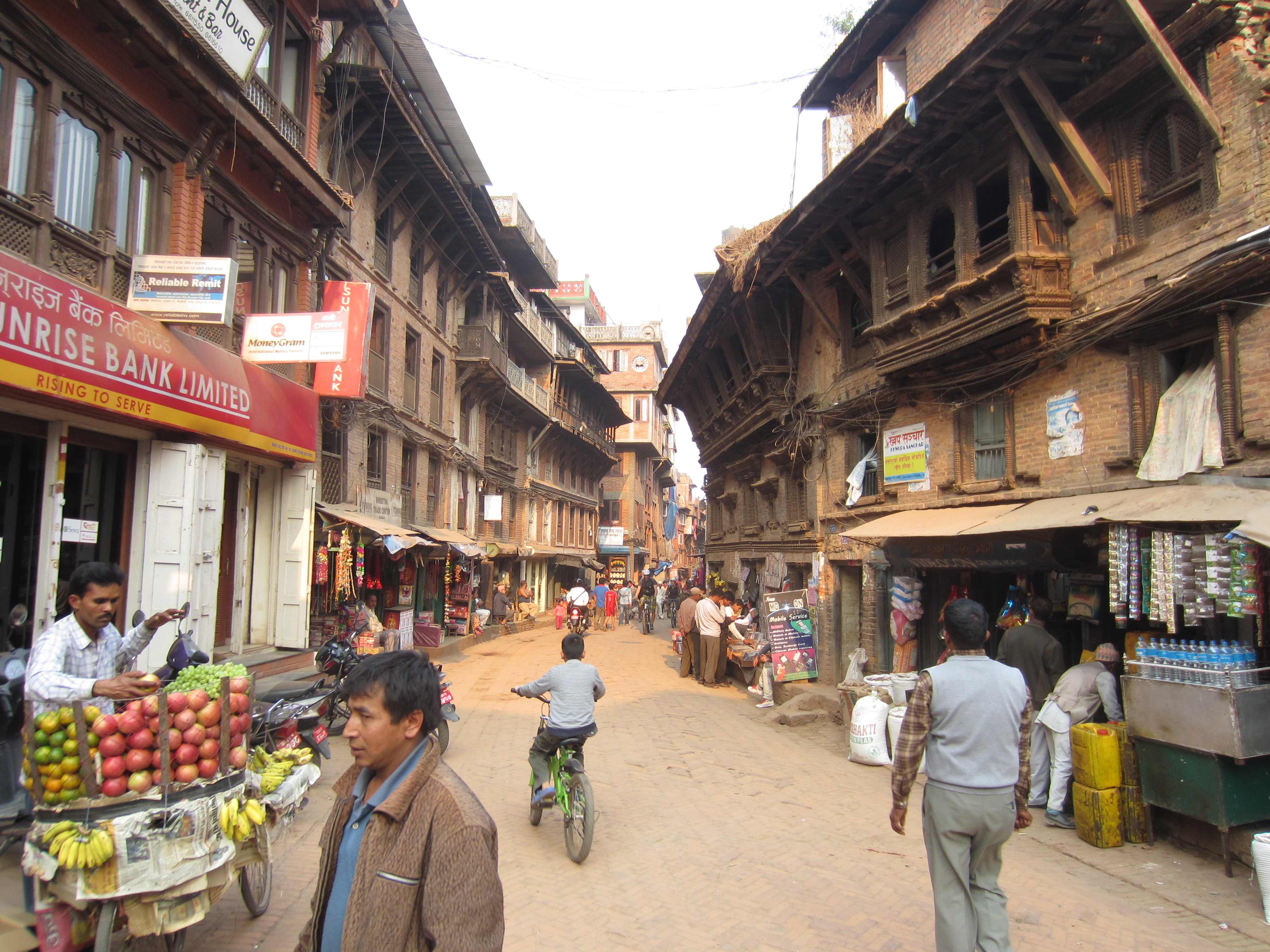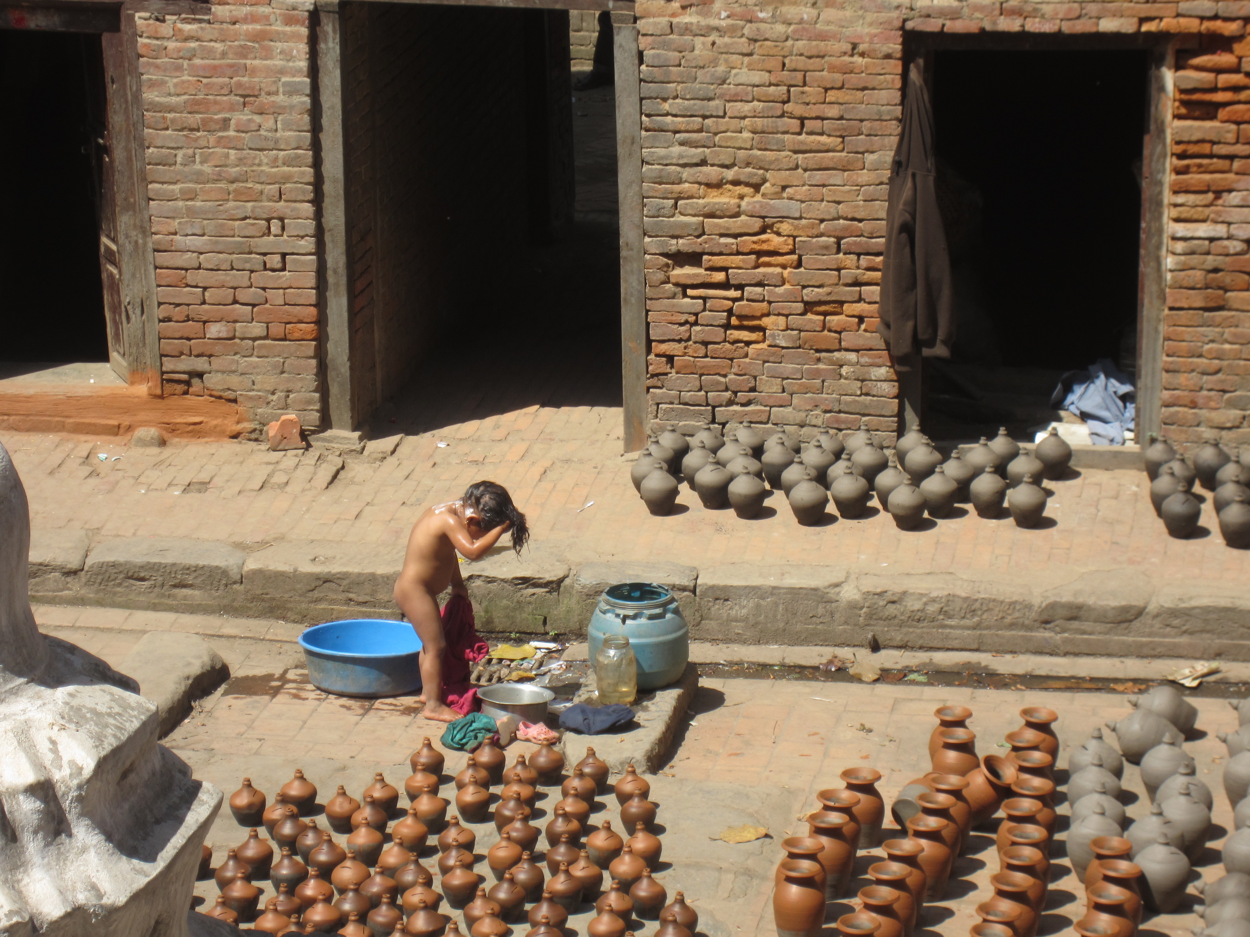 Typical street scene, BhaktapurBath time with plastic, metal and clay vessels, Bhaktapur