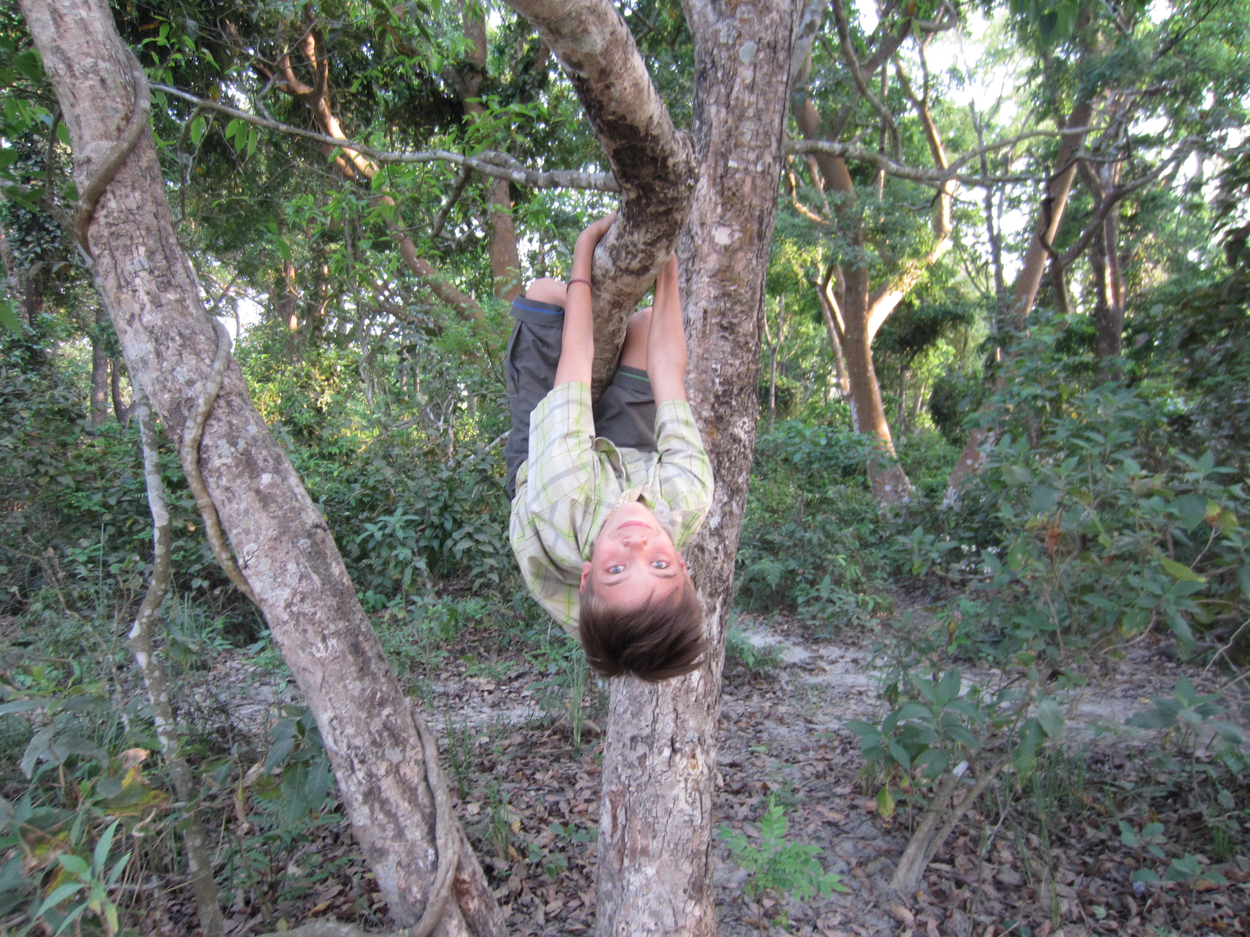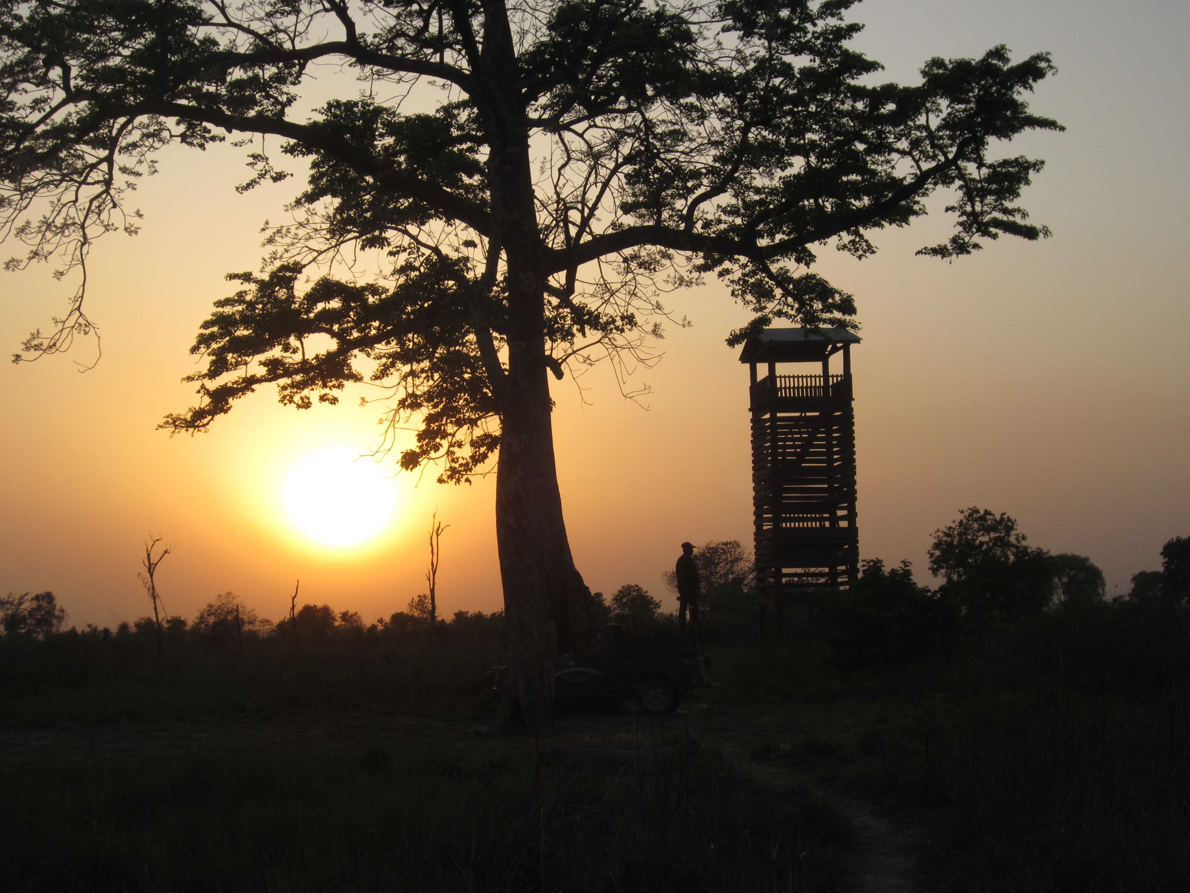 Tiger printRhino print (one three-toed footprint), Bardia National ParkA viewing tower at sunsetTemporary-lapse-in-parental-judgement bridge, Bardia National ParkNo posts, no cables, no rails, no problem, Bardia National ParkMama and baby rhino (shot through binoculars), Bardia National ParkJuvenile green-shirted Lathropicus henrii, Bardia National ParkAdult male, Bardia National ParkSantin on safari (photo added by husband under protest from author), Bardia National ParkBoys in a jeep with Santa, our guide, Bardia National ParkObserving wildlife from aboveTiger