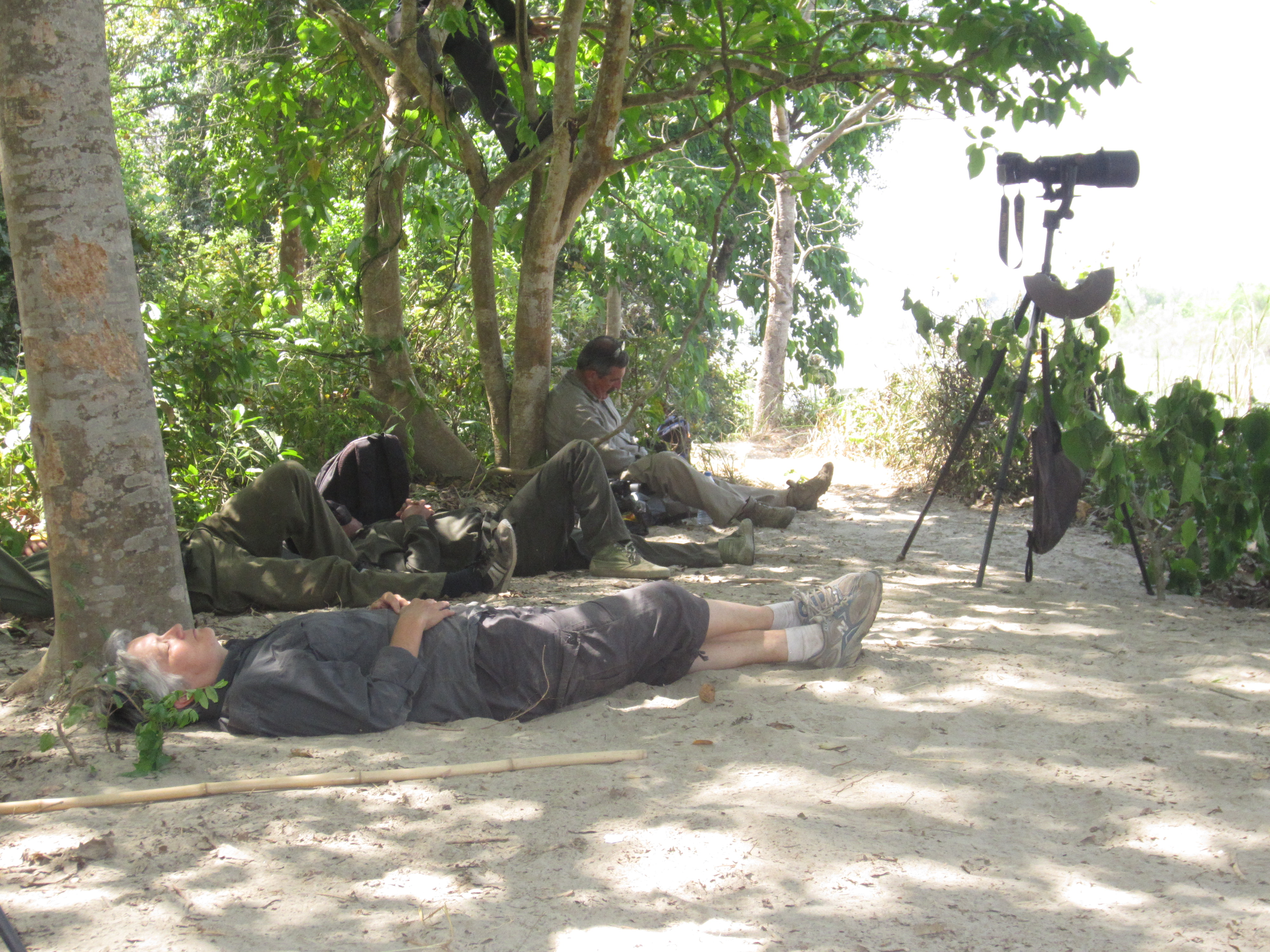 Hour 7. “Show yourself you black and orange striped devil” hisses Coalter. An inconsiderate tourist group with obnoxious cameras and video equipment noisily tramp in wearing bright colors (a safari no-no), preparing to set up their equipment, including bright lights, for the night. We hate them and it’s all their fault we didn’t see anything.