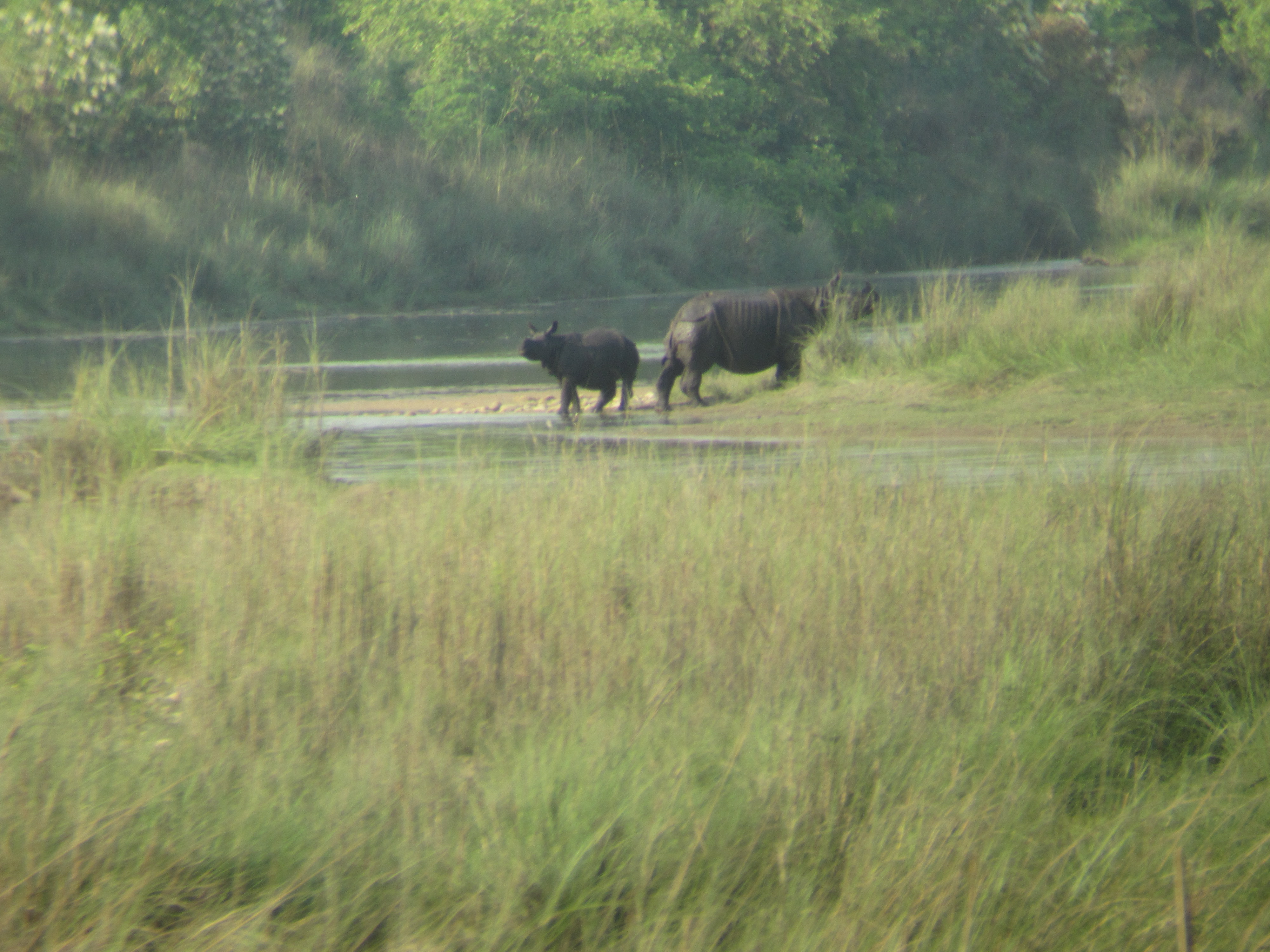 Well, you get the picture and you probably guessed that even after two whole days in the jungle we never did see that tiger. But there were so many other delights and excitements. We crossed a rickety bridge that looked like it belonged in a state fair fun-house, bouncy and tilted a little bit to one side with no handrails and a few missing planks here and there, over a river where we had seen a crocodile a ways back (that sounds really bad as I write it, I don’t think they eat people). We saw langur and rhesus macaque monkeys, incredible birds like the wooly-necked stork and the crested hawk eagle, swamp deer, barking deer, hog deer, spotted deer, mugger and gharial crocodiles, mongoose, a herd of wild boar, and lets not forget the tiger man. We saw tiger paw prints everywhere and had exciting moments when the jungle animals let out their loud warning cries that a tiger was in the vicinity. We decided we would become birders. We had wonderful drives through the grasses and airy jungle watching two amazing sunsets. Mother Nature finally gave us our large game consolation prize and offered up a spectacular rhino show for us. We watched three one-horned rhinos, including a mother and baby, bathe in the river with the baby nuzzling alongside its mother and climbing on her back (to the delight of the mother spectators), and the two big rhinos getting in a little fight (to the delight of almost everyone else). And, as the parting gift, we came upon a lone, white-tusked bull elephant ambling through the tall grass at the edge of the jungle under a bright orange sunset, just as an elephant should be, with 10 minutes left to spare in our safari. Although we were not the top contenders in the Bardia wildlife game, and our competitors saw tigers the following day while we were back at the lodge doing our laundry, it was pretty darned incredible.
